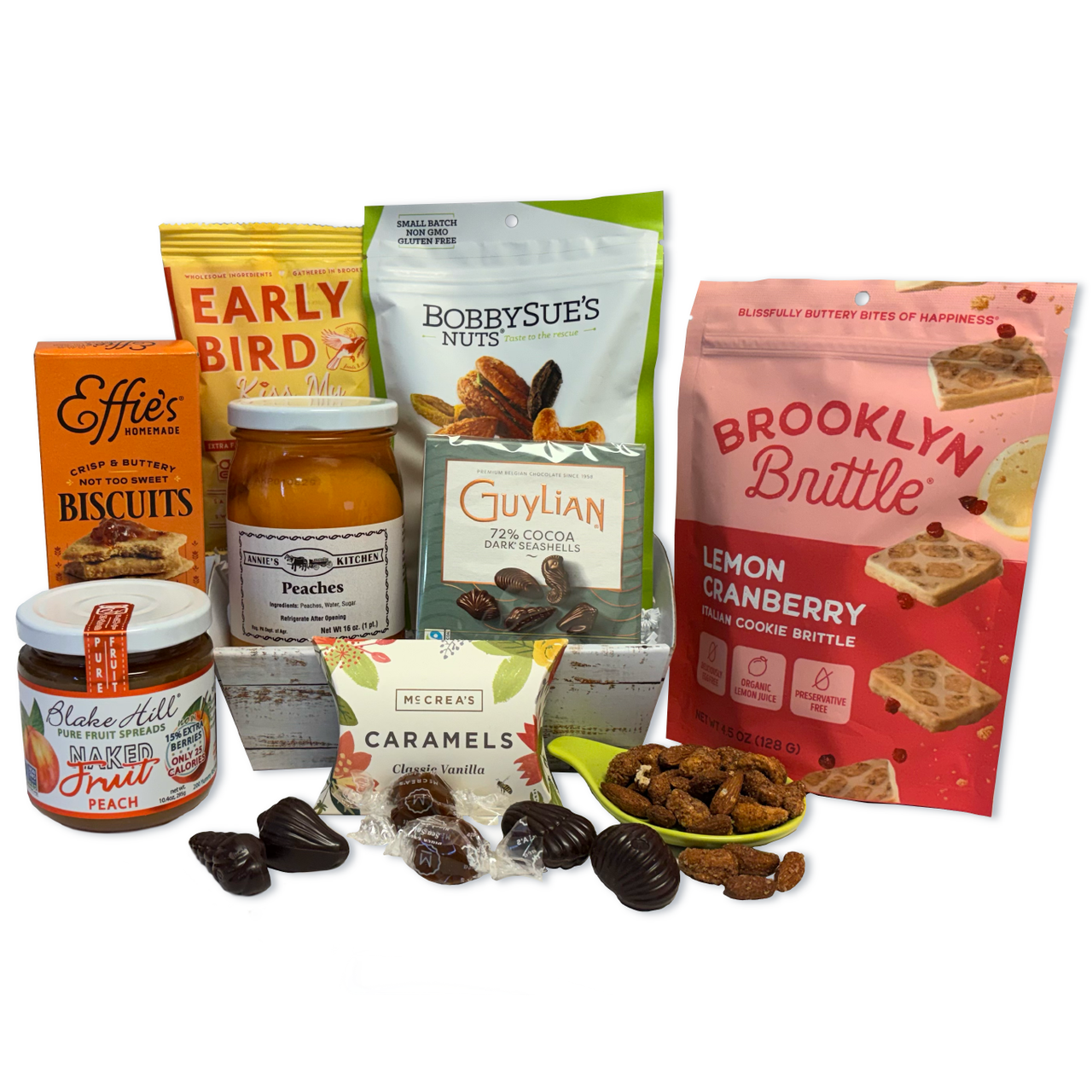 Joyful Bites is a collection of artfully prepared biscuits, nuts and caramels made from the artisan’s Grandmother’s recipe A delicious finishing touch to Joyful Bites is a jar of scrumptious canned peaches from an Amish Cannery in Lancaster PA and a peach spread with no sugar added. What fun to make Peach Melba. Recipe card is included.